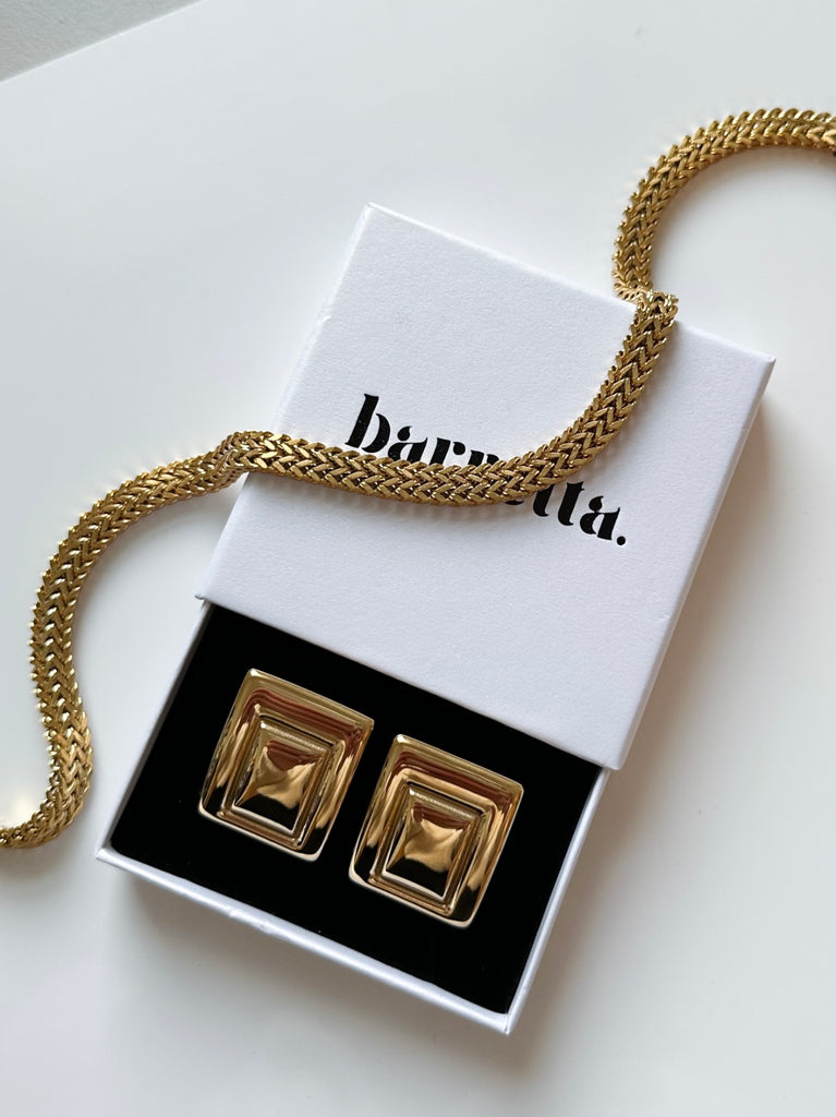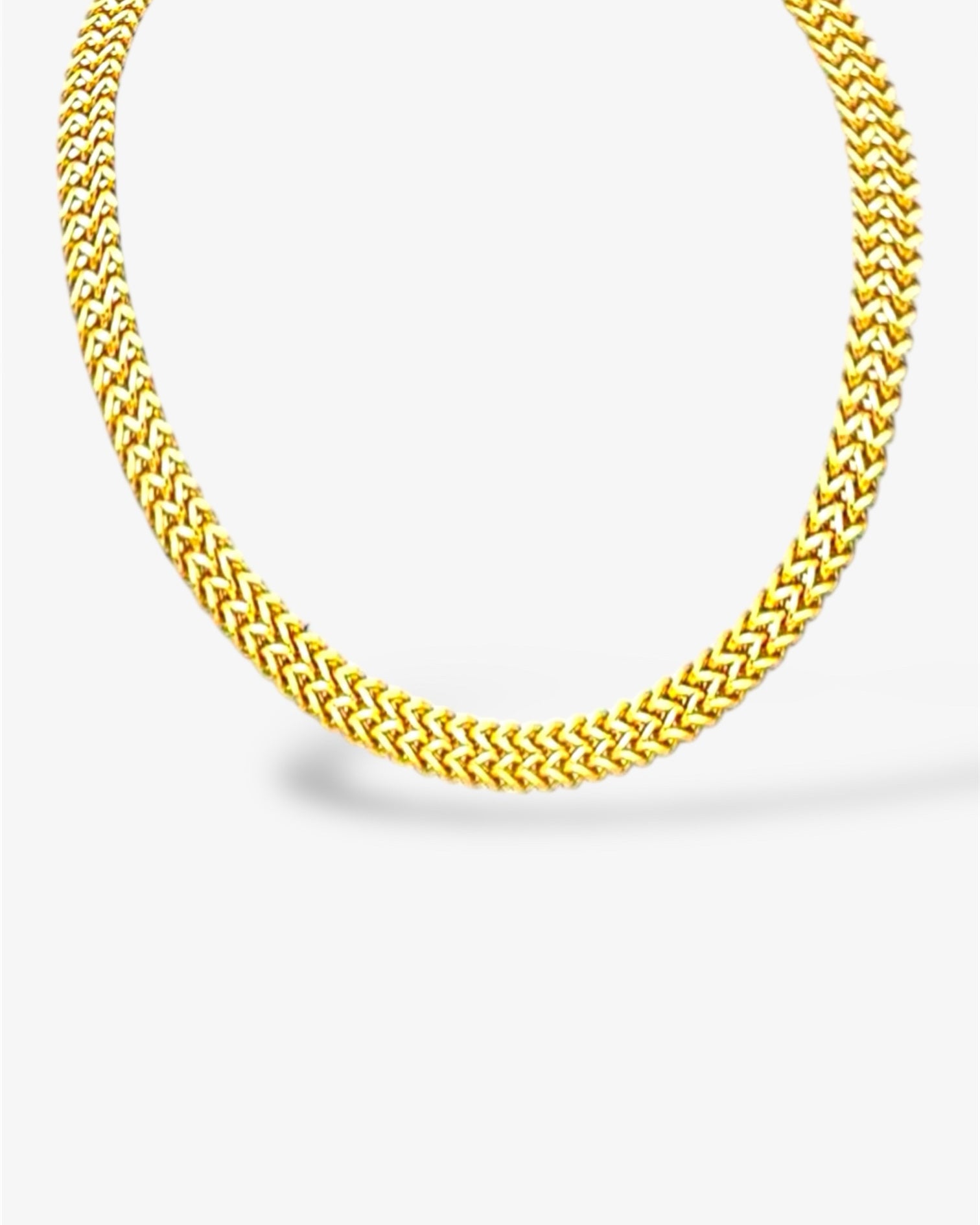 Refined and radiant, this woven gold chain brings a touch of quiet luxury to any look. Its intricate, chevron-inspired pattern catches the light from every angle, creating a rich texture that feels both timeless and modern. Elegant on its own and striking in a stack, it’s the kind of piece that instantly elevates your neckline.