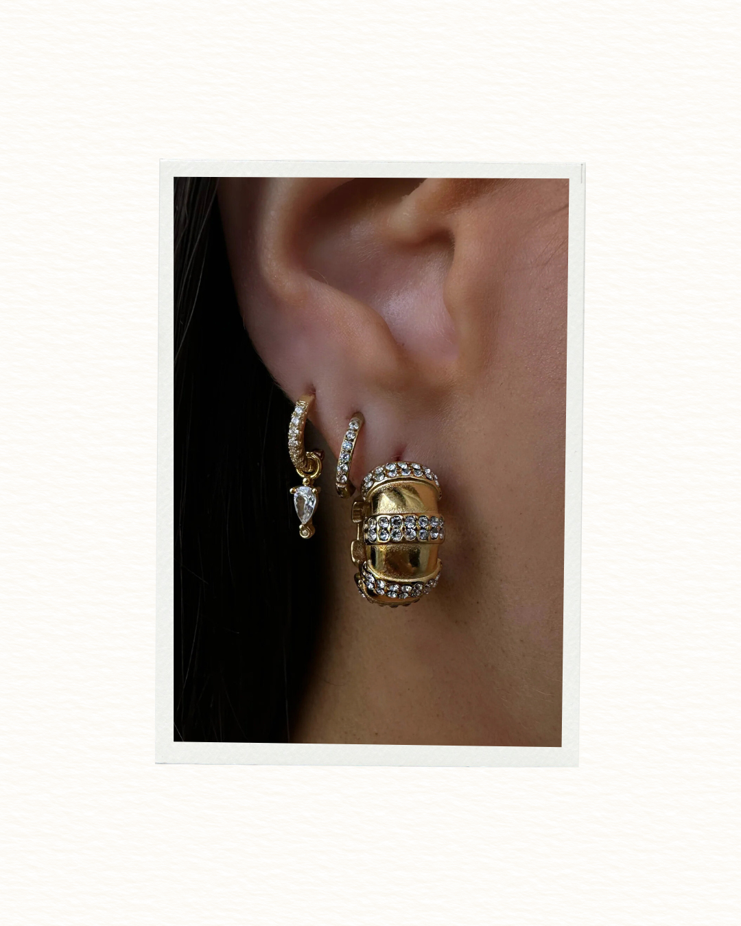 Delicate with a touch of sparkle, these gold huggies bring effortless elegance to your everyday style. The textured hoop adds subtle detail, while the pear-cut crystal drop lends just the right hint of shimmer and movement. Refined, feminine, and beautifully understated—perfect on their own or layered in a curated ear stack.