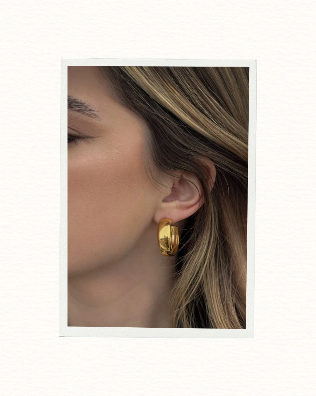 Polished, minimal, and endlessly wearable, these gold hoops bring a refined edge to any look. Their rounded, full-bodied silhouette feels sleek and contemporary, catching the light with every turn. A true wardrobe essential: effortless, versatile, and forever in style.